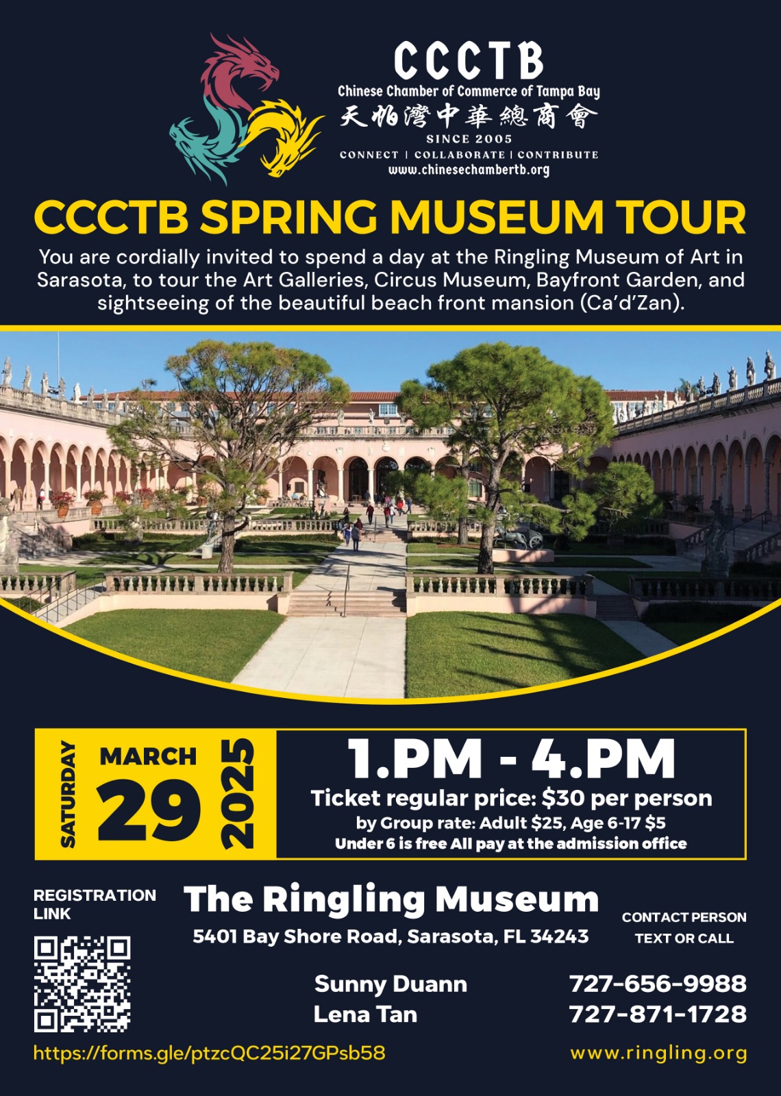 許多坦帕灣的華人朋友對Ringling Museum耳有所聞,卻未曾親自參觀;也有些朋友雖曾造訪,卻未能細細品味其館藏的一萬餘件珍貴藝術作品。為了豐富大家的精神生活,商會特別籌劃了這次的文化之旅,誠摯邀請您參加!